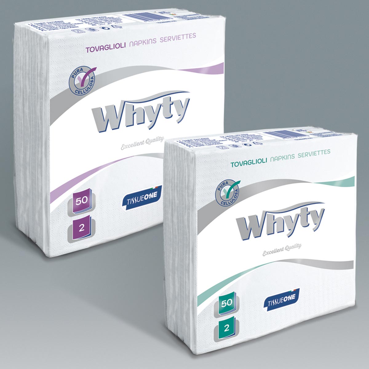 Tovaglioli due veli in carta di pura cellulosa nei formati 33 x 33 cm e 38 x 38 cm.